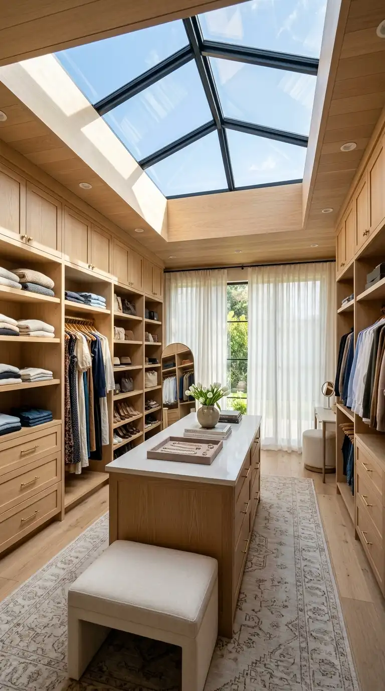 If possible, position your dressing room to take advantage of natural light. A skylight or large window makes the space feel open, airy, and inviting. Natural light is essential for accurate color matching when choosing outfits. Pair with sheer window treatments for privacy while maintaining brightness.