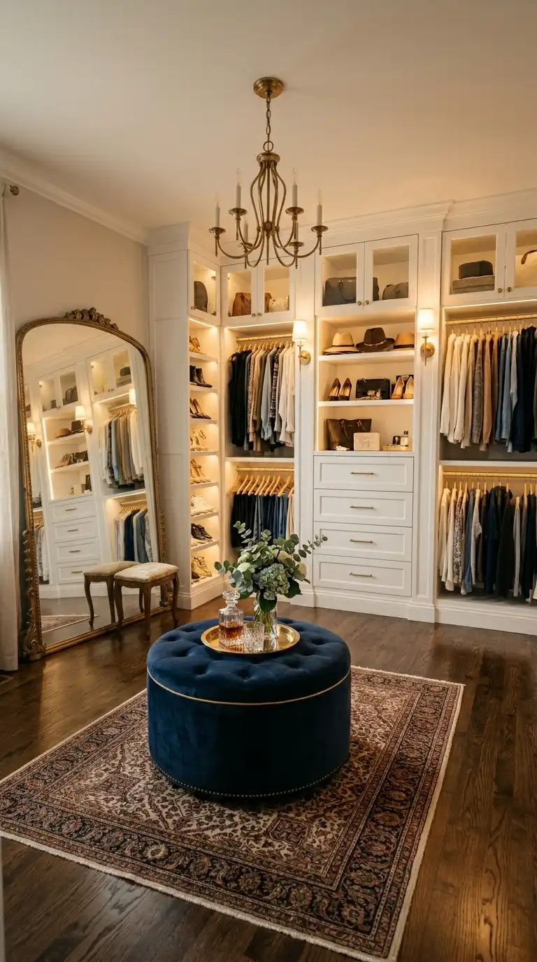 Create a comfortable seating area within your dressing room to make the space feel like a personal retreat. Add a plush ottoman, chaise lounge, or velvet bench. A small side table for coffee or tea and soft lighting enhance the sense of relaxation.