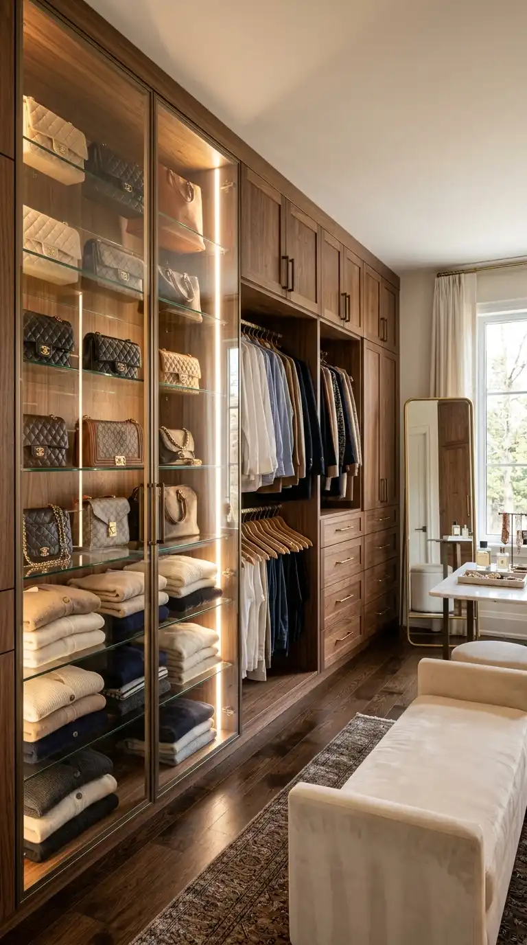 Glass-front cabinetry adds elegance and allows you to display favorite handbags, accessories, or folded clothing. Use frosted glass for privacy or clear glass with internal lighting for a boutique-inspired look. Glass-front sections break up solid cabinetry and add visual interest.