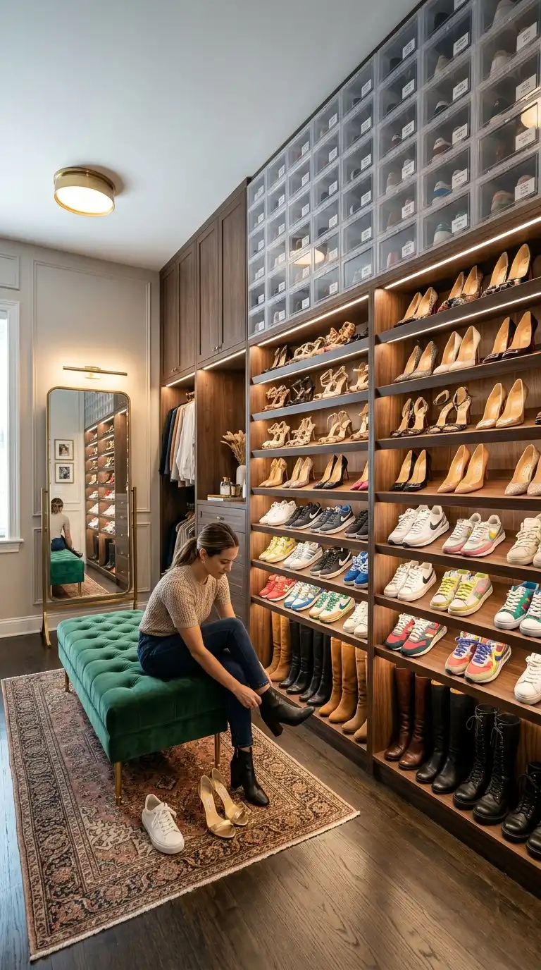 For shoe enthusiasts, a dedicated shoe wall is essential. Design floor-to-ceiling shelving angled to display shoes attractively, or use clear stackable boxes for protection while maintaining visibility. Incorporate a bench or seating area nearby for trying on footwear. A shoe wall turns your collection into a design feature.