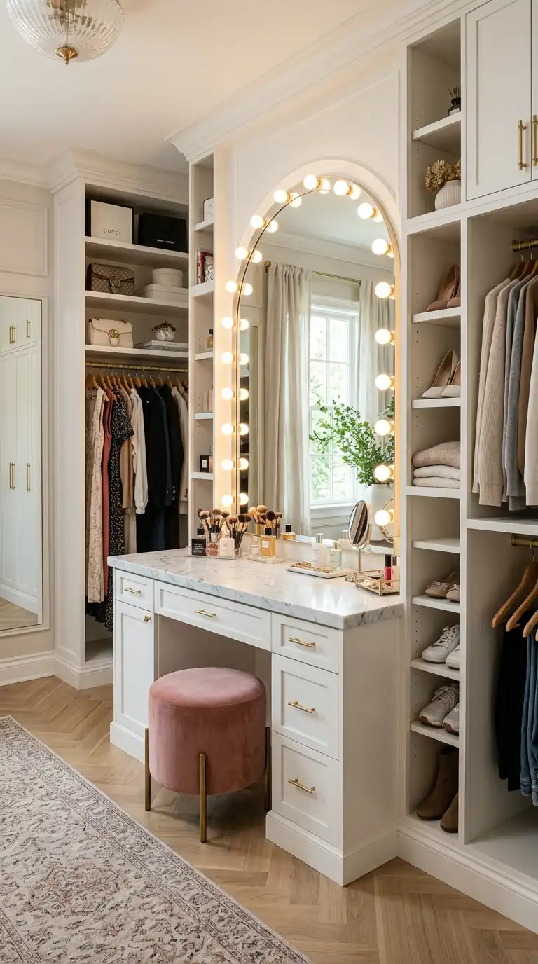 Incorporate a vanity into your dressing room for a complete grooming and dressing experience. Position the vanity near natural light or add a Hollywood-style mirror with built-in lighting. Include drawers for makeup and accessories, and add a comfortable stool. This setup streamlines your routine.
