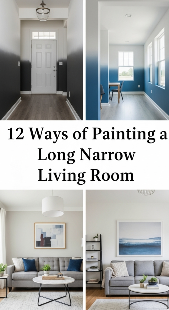 This is one of the most effective painting strategies for narrow rooms because it works with the room’s architecture rather than fighting against it. The dark end walls become natural focal points for artwork, mirrors, or your main furniture arrangement.