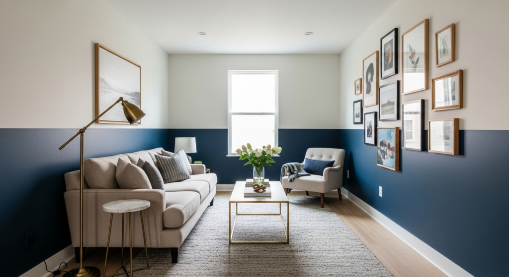 Divide your walls horizontally by painting the lower portion one color and the upper portion another, separated by a chair rail or simply a clean paint line. This technique adds architectural interest while drawing the eye around the room’s perimeter rather than down its length.