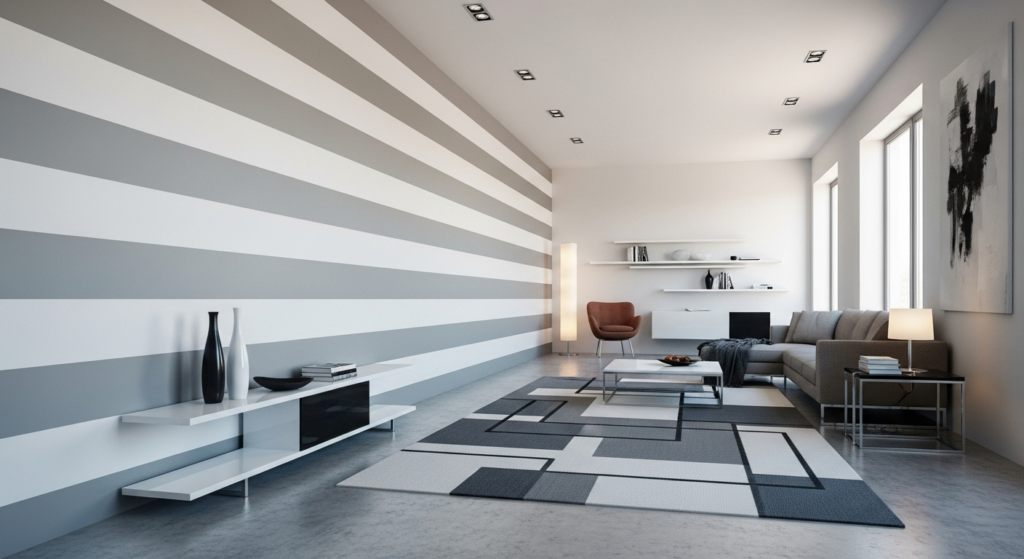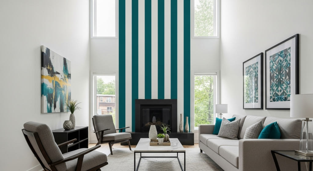Use two coordinating colors in similar values (lightness/darkness) for subtle stripes, or create bolder contrast with light and dark combinations. Stripes can be wide (12-18 inches) for a modern look or narrow (4-6 inches) for a more traditional feel. For maximum impact, paint stripes on the long walls where they’ll be most visible.
