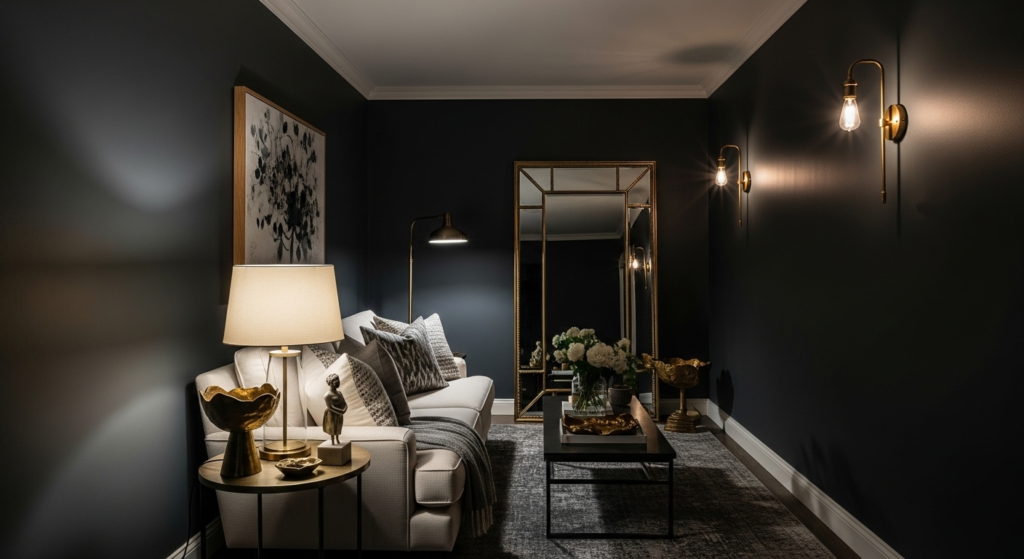 Choose deep colors like charcoal, navy, forest green, chocolate brown, or even black. The key to making dark colors work in narrow spaces is excellent lighting—layer ambient, task, and accent lighting throughout. Use metallic accents, mirrors, and light-colored furniture to reflect light and prevent the space from feeling cave-like.