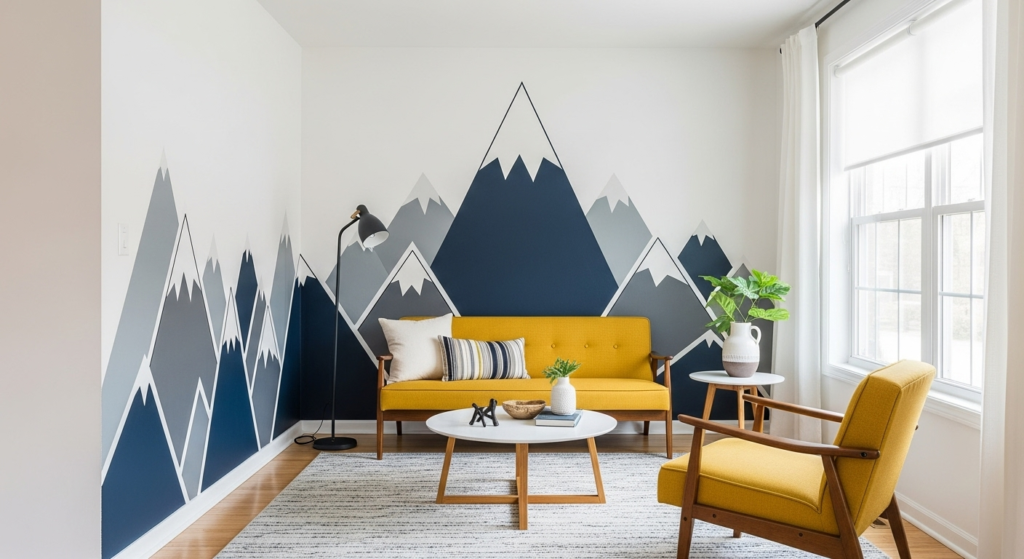 Plan your geometric design carefully on paper first, then transfer it to the wall using painter’s tape. This project requires precision and patience but creates a truly custom look. Choose a color palette of 2-4 coordinating colors that complement your overall design scheme.
