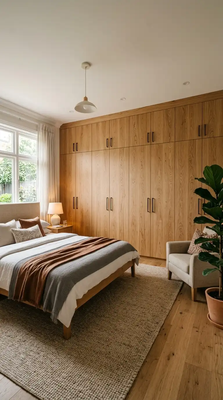 White oak offers the warmth of natural wood with a light, airy appearance that suits minimalist and Scandinavian interiors. A handleless wardrobe with push-to-open mechanisms creates a seamless, uncluttered surface that allows the wood grain to take center stage. The clean lines and simple form emphasize craftsmanship and material beauty. This design works beautifully in small bedrooms where visual simplicity is key, and pairs well with neutral walls and natural textiles.