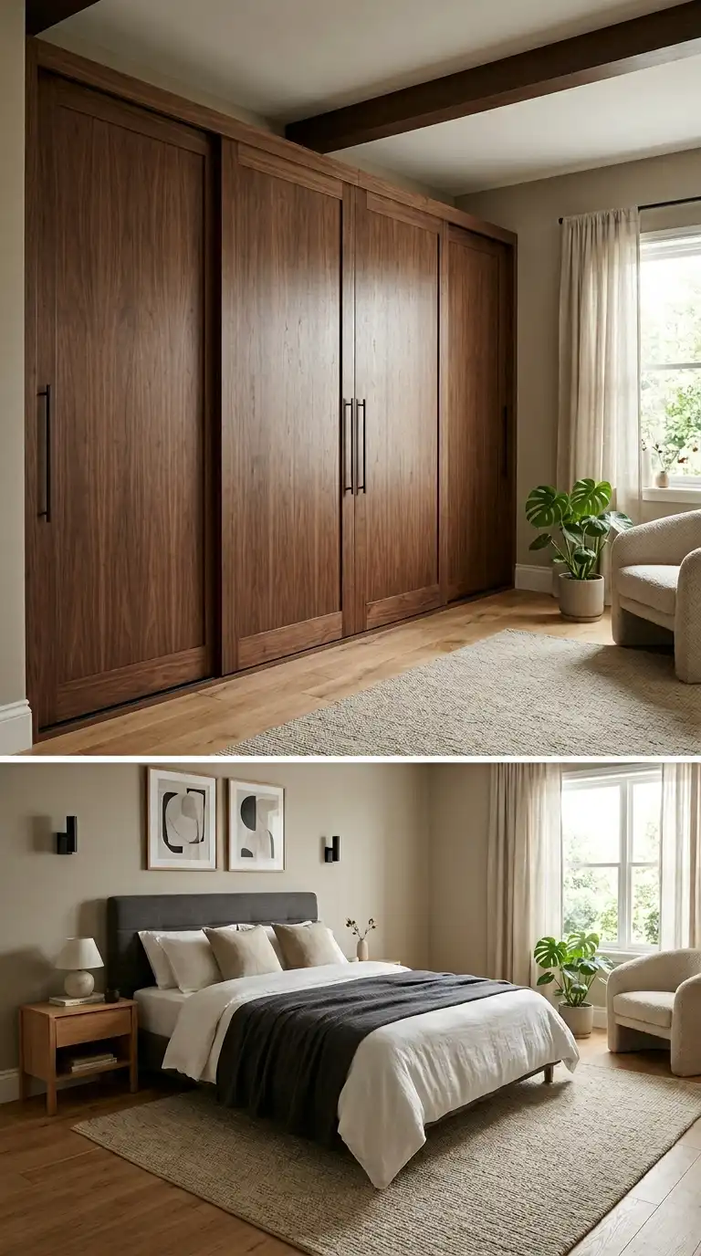 Walnut wood offers rich, deep brown tones and distinctive grain patterns that add sophistication to any bedroom. A sliding wardrobe in walnut makes the most of the wood’s natural beauty, with vertical grain alignment that draws the eye upward and creates a sense of height. Sliding doors are ideal for compact spaces where hinged doors would require swing clearance. Pair with matte black or brushed brass hardware to complement the warm tones of the walnut.