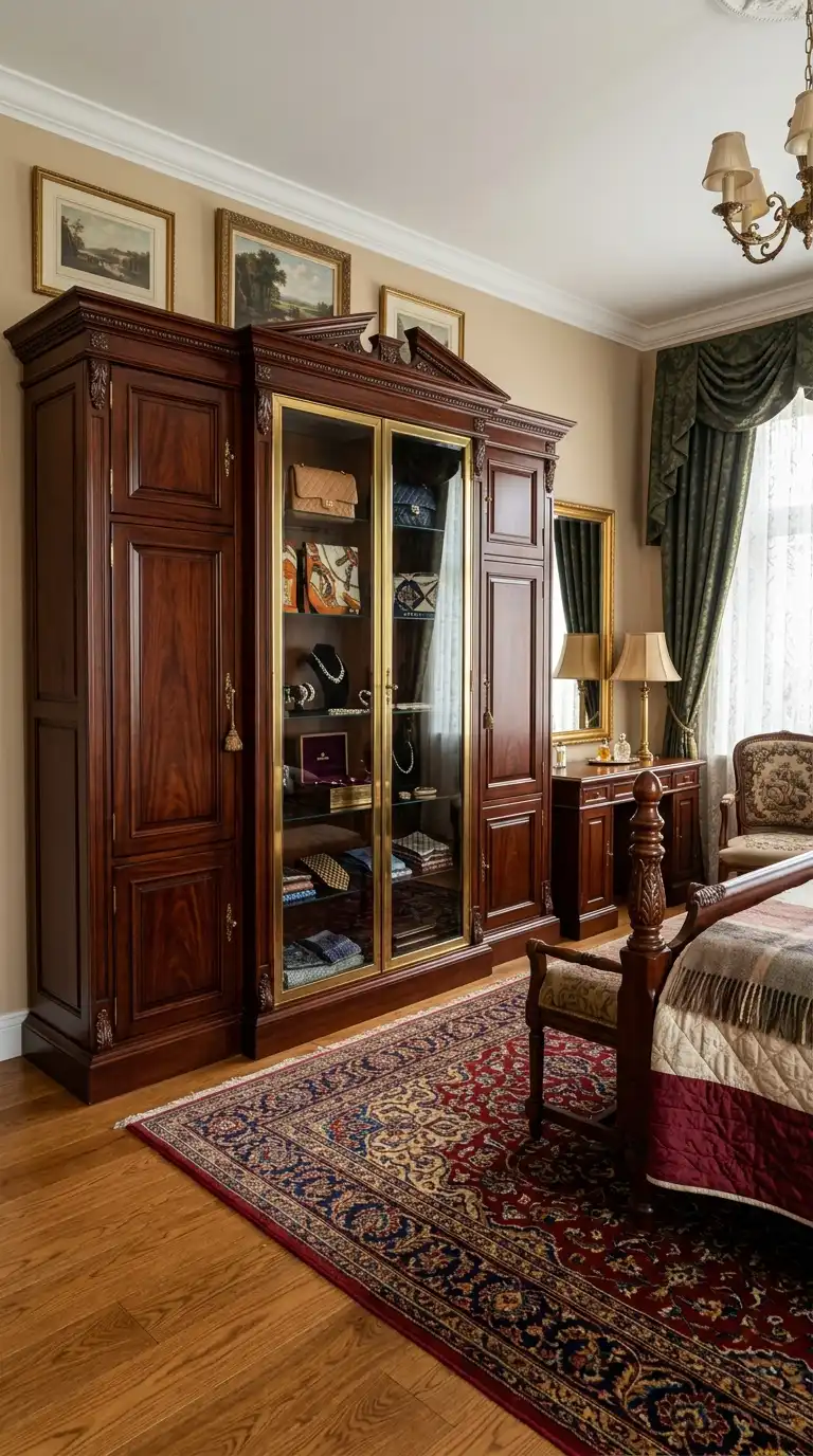 Mahogany wood is prized for its deep, reddish-brown tones, fine grain, and exceptional durability. A mahogany wardrobe with glass-front sections combines the warmth of solid wood with the lightness of glass, creating a design that feels both traditional and contemporary. Use glass sections to showcase your favorite accessories, handbags, or folded items, while solid mahogany doors conceal the rest. Brass hardware enhances the rich tones of the mahogany and adds a touch of elegance.