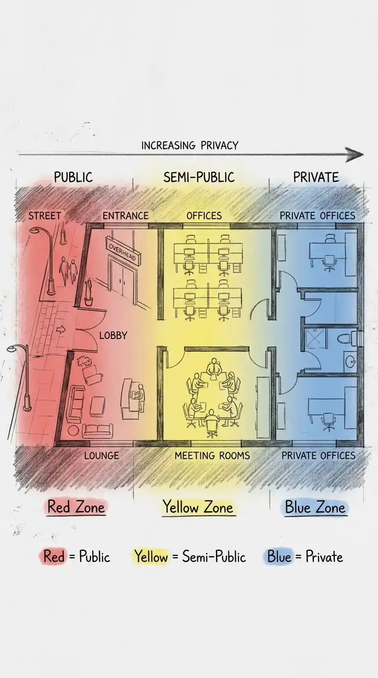 This diagram is ideal for houses, offices, and public buildings. The emotional effect is hierarchical, graduated, and privacy-conscious.