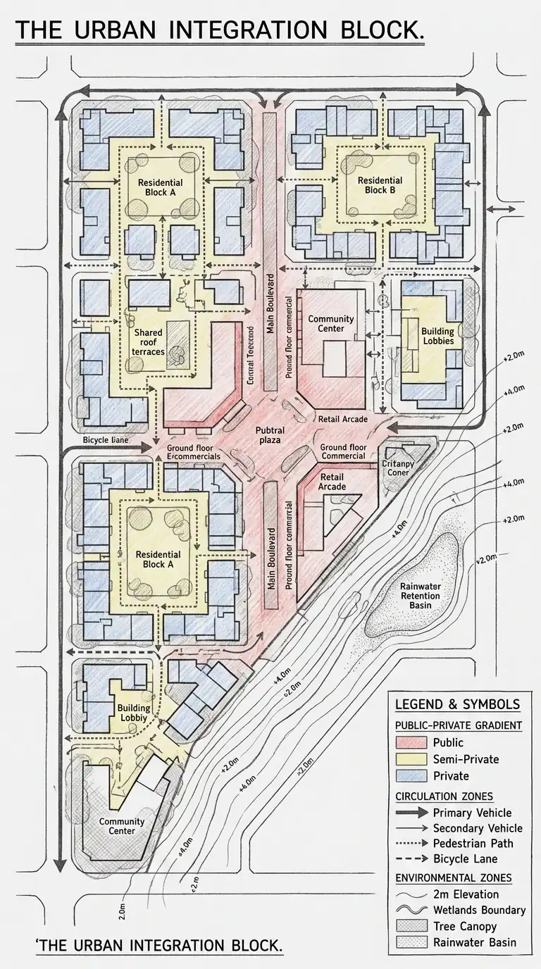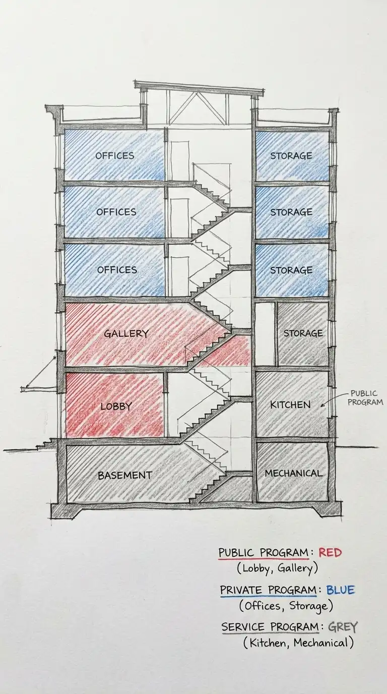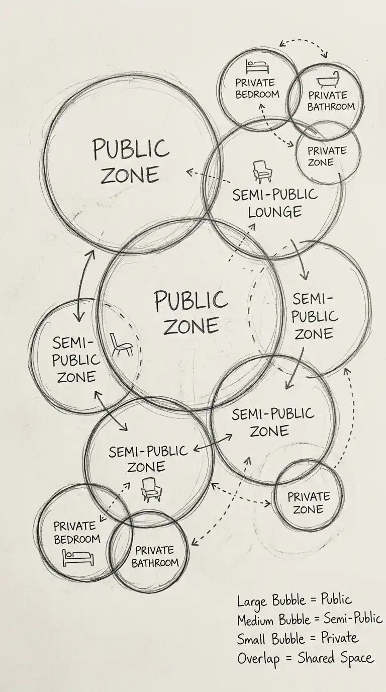 A zoning diagram is not a floor plan. It has no walls, no doors, no dimensions. It is a diagram of organisation. It answers the question: what goes where? A public-private gradient shows privacy. A bubble diagram shows adjacency. A colour-coded plan shows specific locations. A layer diagram shows complexity. A threshold diagram shows edges. A circulation zone diagram shows movement. A service zone diagram shows support. An environmental zone diagram shows climate. A program zone diagram shows function. A vertical zoning diagram shows height. A phasing diagram shows time. A hybrid diagram shows everything.
