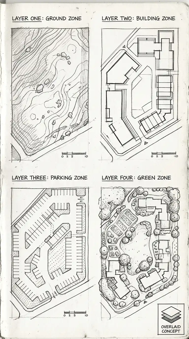 The layer diagram separates zones into different layers. Each layer is a separate sheet or a separate colour. The layers can be overlaid to see the whole. The layer diagram is ideal for complex sites with multiple overlapping zones (e.g., ground zone, building zone, parking zone, green zone).
