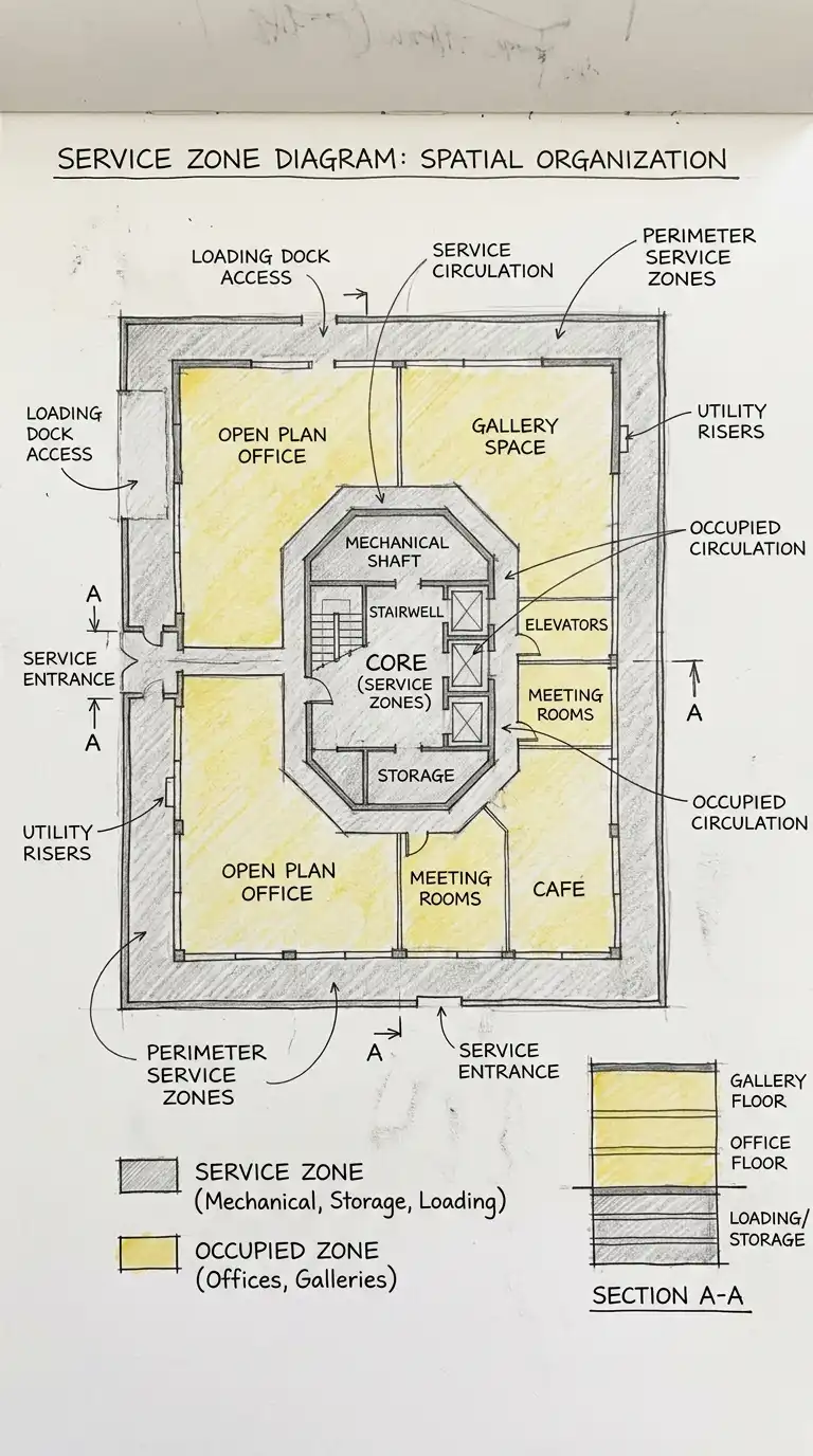 The service zone diagram shows zones for service functions separate from occupied functions. Service zones include mechanical rooms, electrical rooms, storage, loading docks, and trash rooms. Service zones are often placed at the perimeter or in the core.