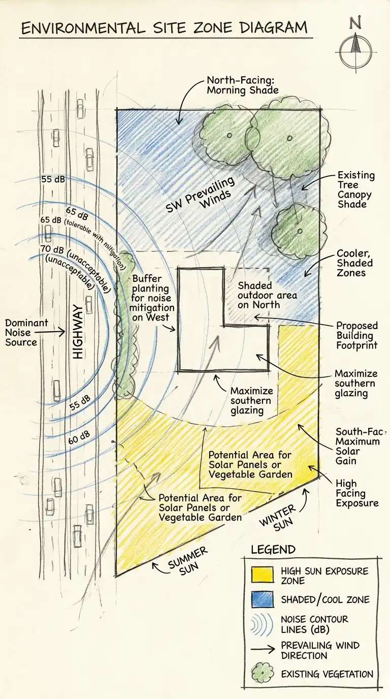 The environmental zone diagram shows zones with different environmental conditions. Sun zones are south-facing (northern hemisphere). Shade zones are north-facing. Wind zones are exposed or sheltered. Noise zones are quiet or loud. The environmental zone diagram is a site analysis tool.