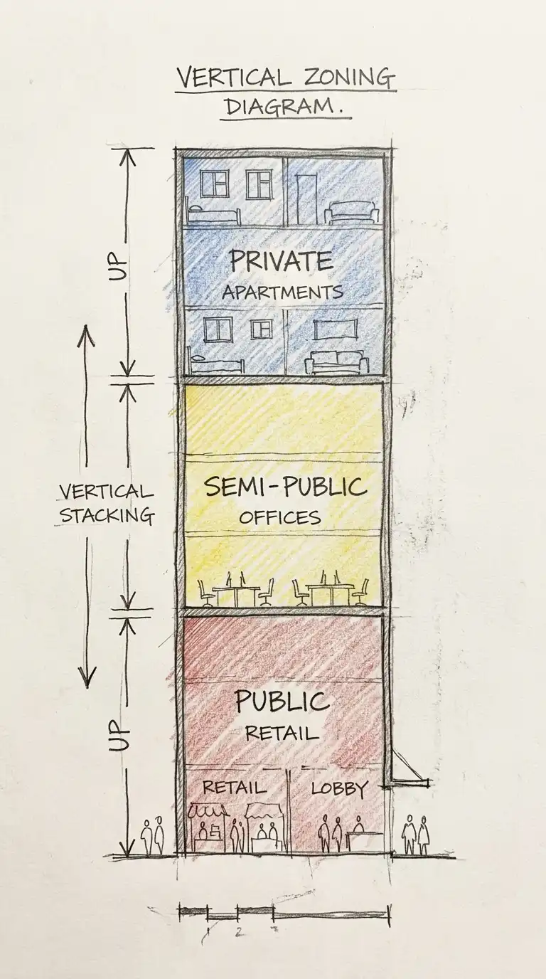 The vertical zoning diagram shows zones stacked vertically. Ground floor is public. Middle floors are semi-public. Top floors are private. The vertical zoning diagram is ideal for mixed-use buildings and skyscrapers.