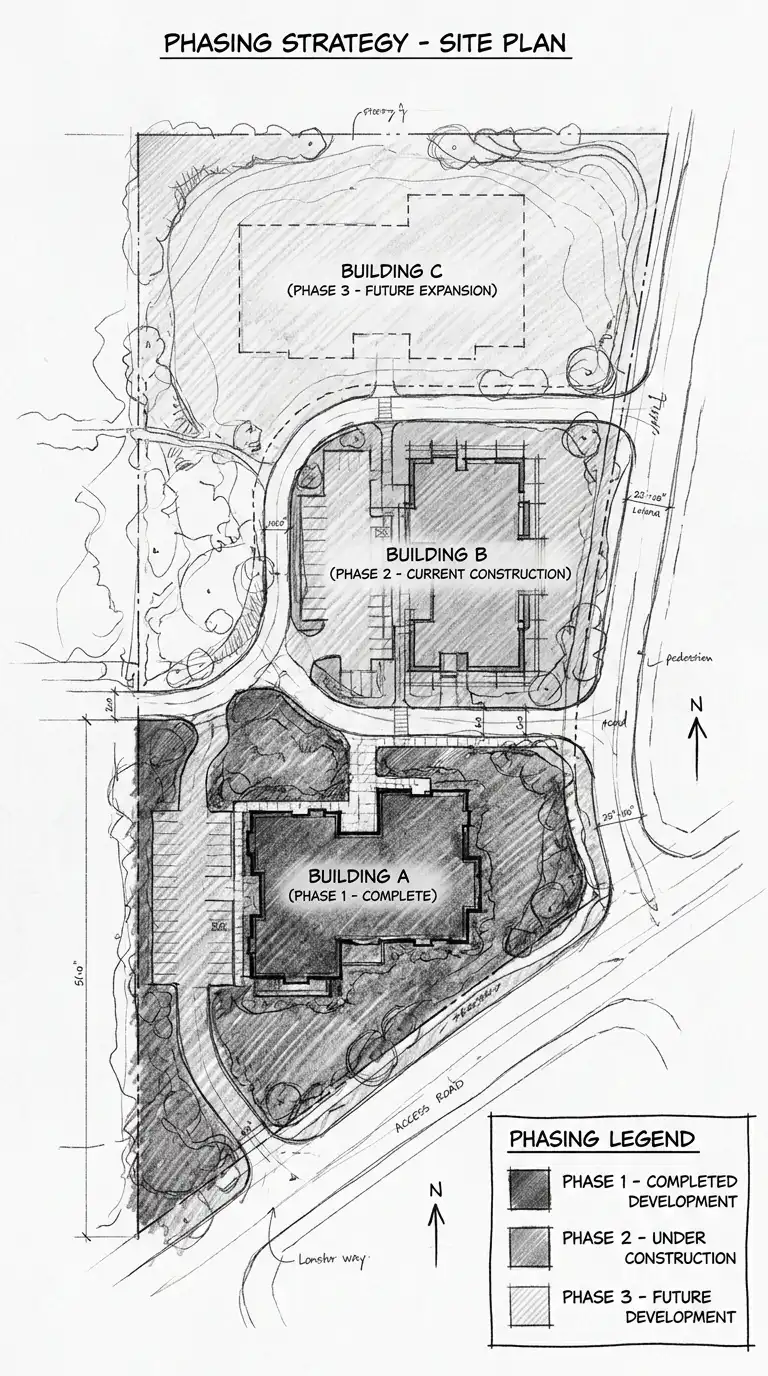 The phasing diagram shows how zones are built over time. Phase 1 is the first zone. Phase 2 is the next zone. Phase 3 is the final zone. The phasing diagram is ideal for large projects and master plans.