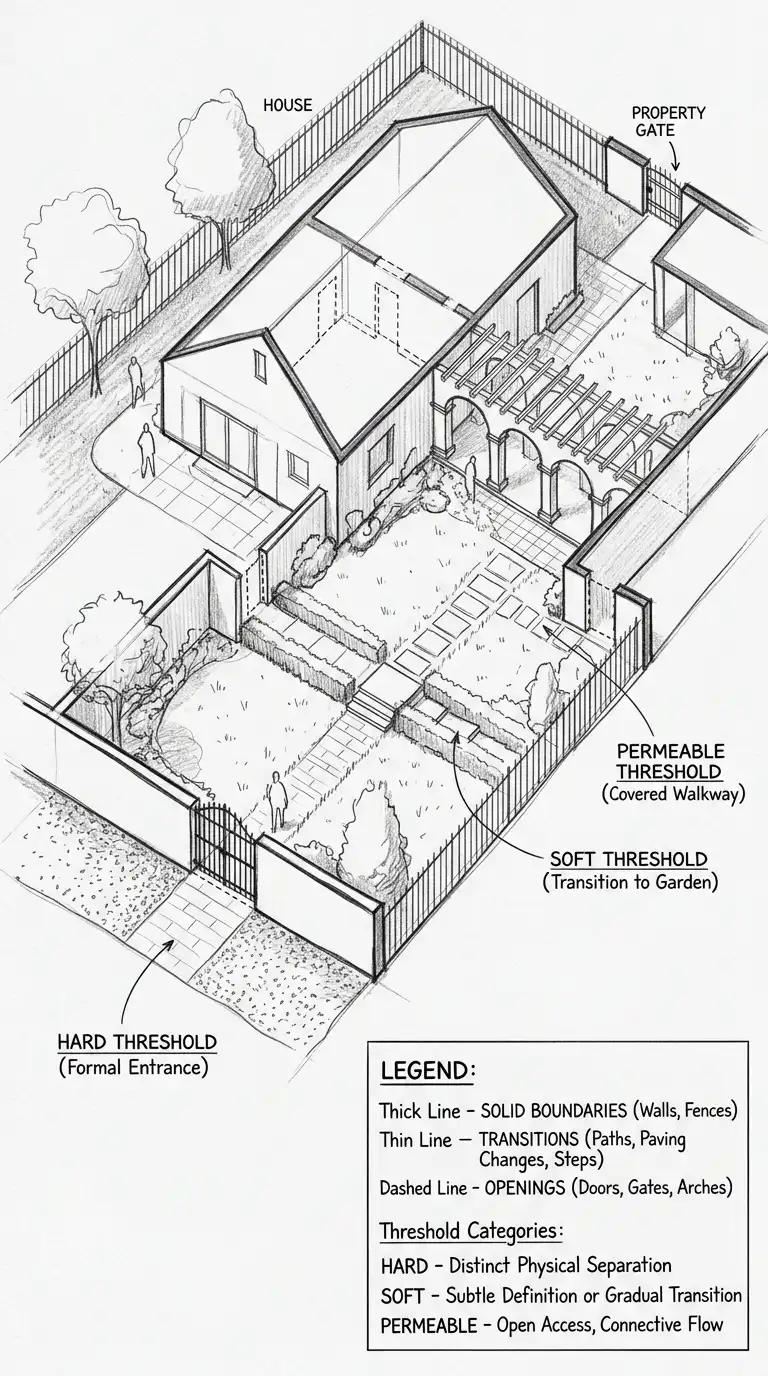 The threshold diagram shows the edges between zones. A thick line is a hard threshold (wall, fence, locked door). A thin line is a soft threshold (path, change in paving, change in lighting). A dashed line is a permeable threshold (gate, door, opening).
