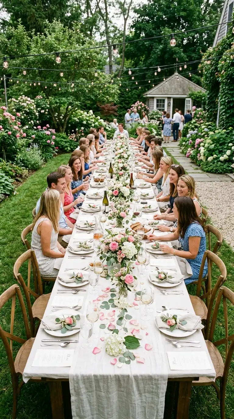 Let fresh flowers be the star of your garden party. Use a long wooden farm table or several round tables draped in white or pastel linens. Create centerpieces with low arrangements of garden roses, hydrangeas, peonies, and eucalyptus. Scatter loose petals along the table. Use floral napkin rings or place a single bloom on each plate. The tablescape should feel abundant, romantic, and garden-fresh.