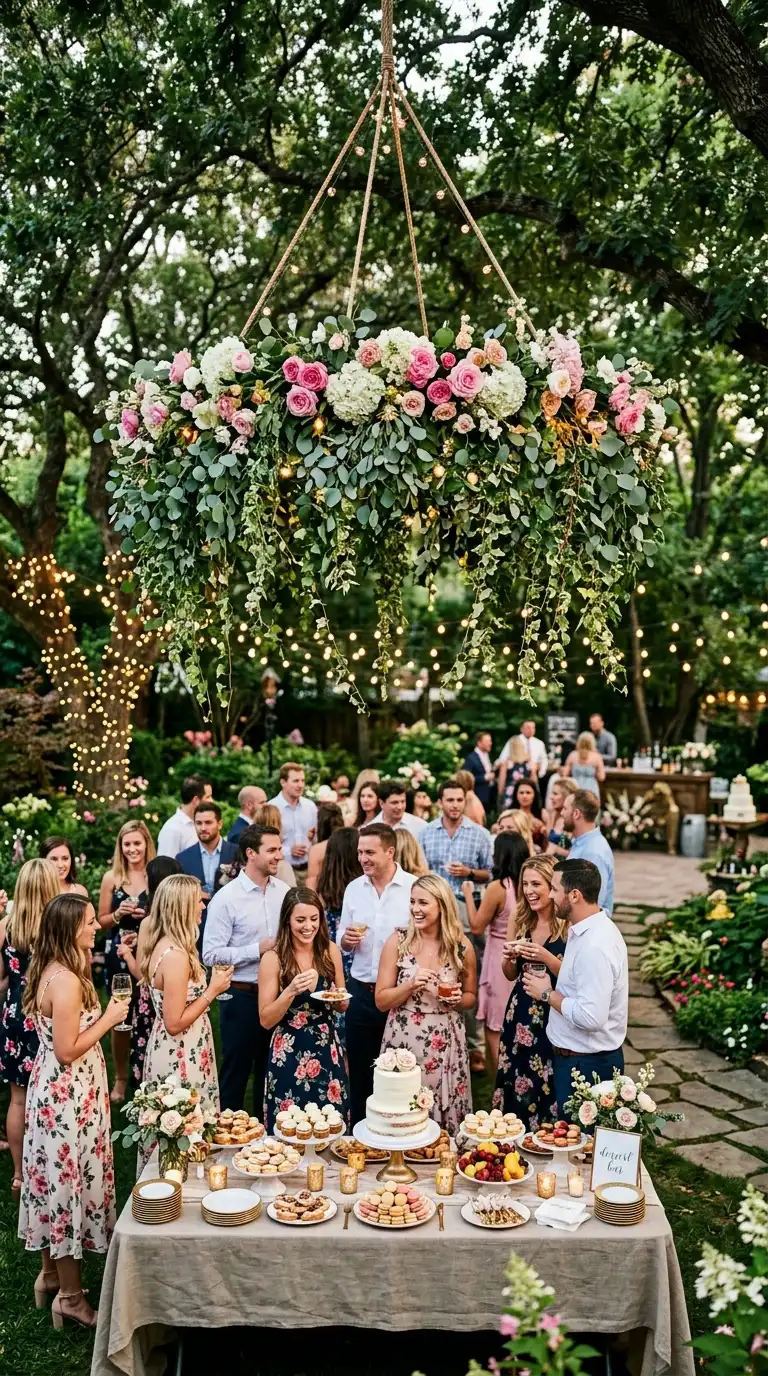 Create a stunning focal point with hanging flower installations above the dining or dessert table. Use a hoop, macrame hanger, or wooden frame to suspend greenery and blooms. Choose flowers that match your color palette—roses, hydrangeas, eucalyptus, or cascading vines. Hanging installations add drama, romance, and a touch of whimsy.