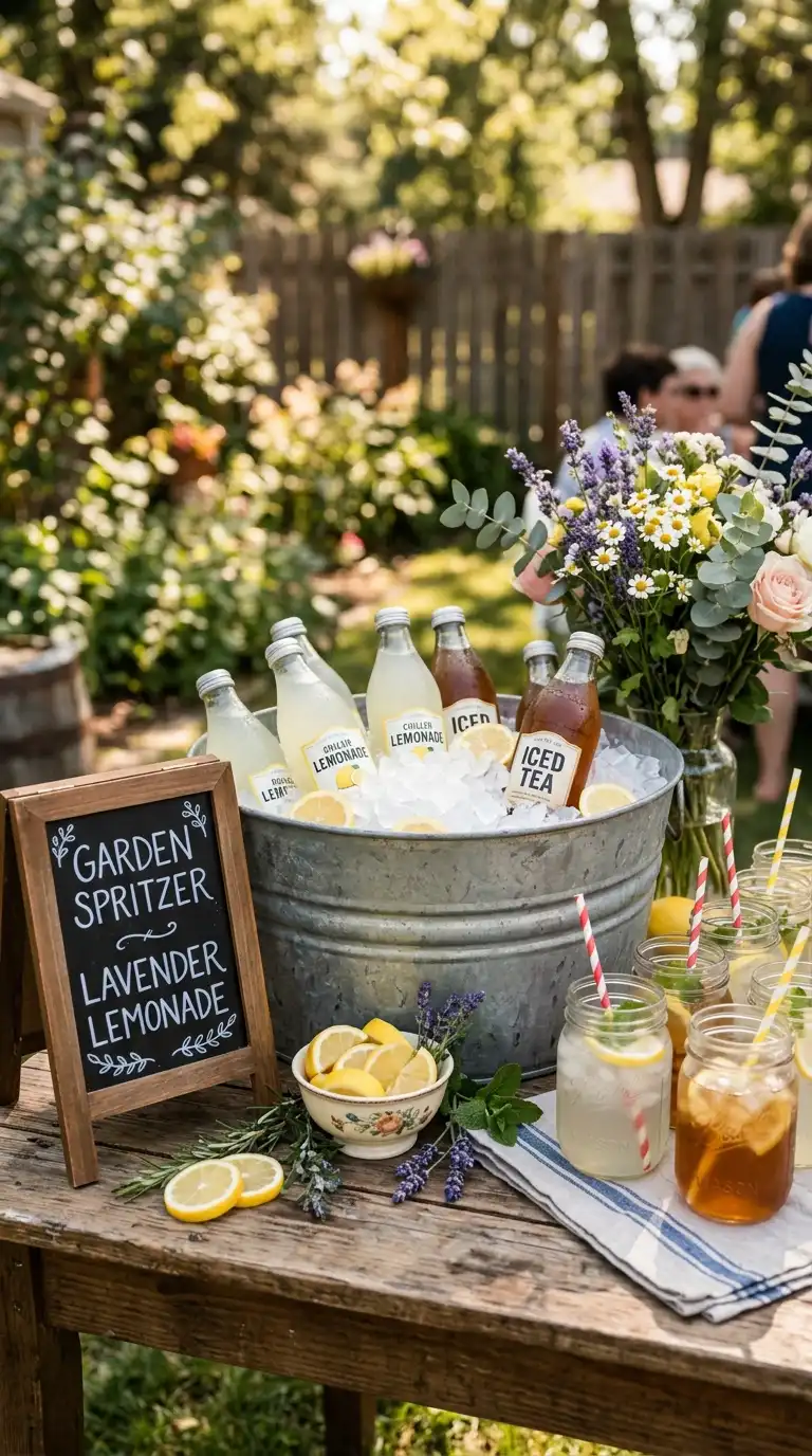 Set up a self-serve drinks station with mason jars as glasses. Serve lemonade, iced tea, infused water (with berries, cucumber, or mint), and a signature cocktail like a rosé spritzer or lavender lemonade. Use a galvanized tub or wooden crate filled with ice for bottles. Add a chalkboard sign listing the drinks. Decorate with fresh flowers and slices of lemon or lime.
