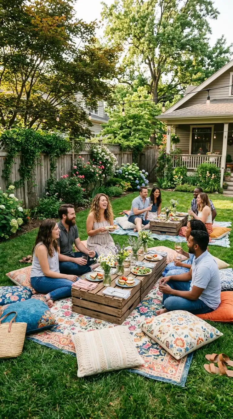 For a casual, bohemian vibe, use picnic blankets instead of chairs. Lay large quilts or vintage blankets on the lawn, and add floor pillows and cushions for comfort. Use low wooden crates as tables. This setup works well for smaller gatherings or for a lounge area away from the main dining table. It encourages guests to kick off their shoes and relax.