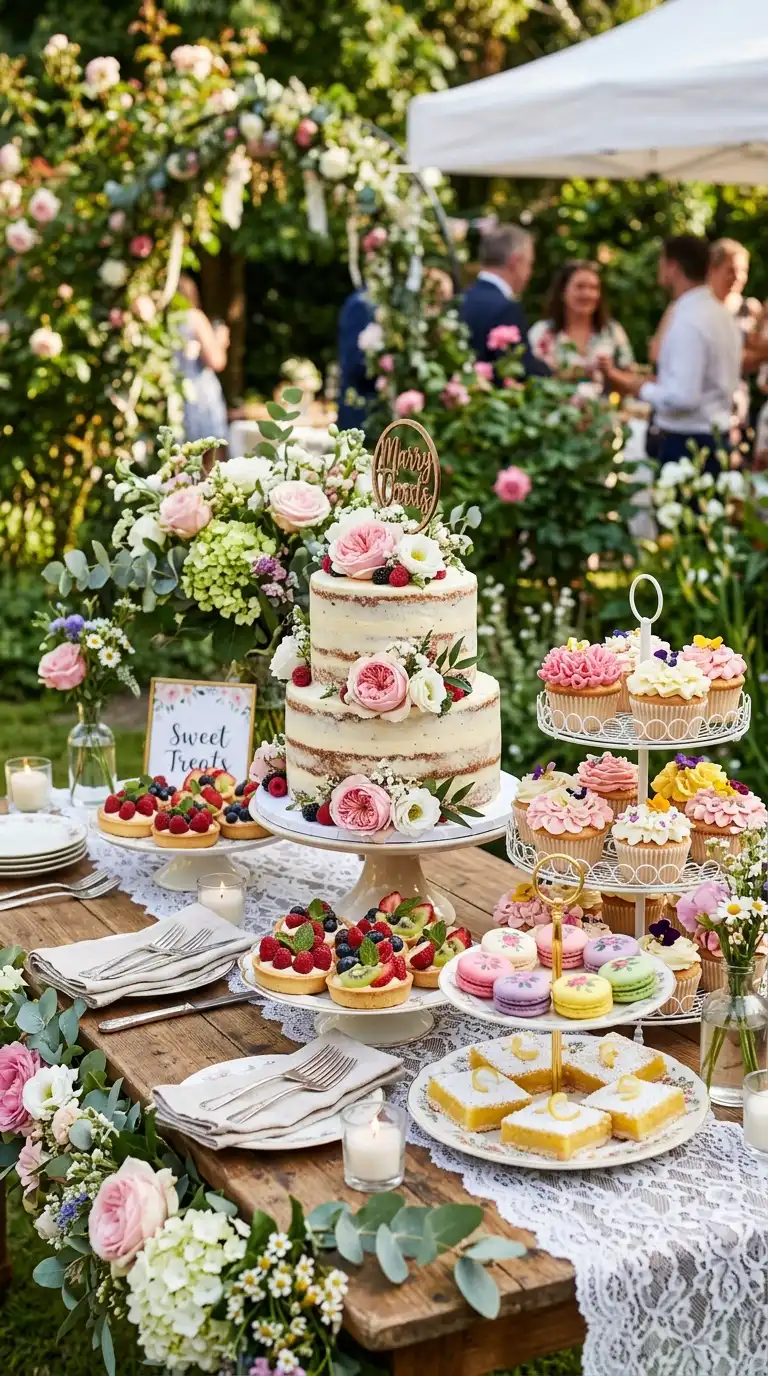 Create a dedicated dessert table as a focal point. Use a wooden table draped with a lace or burlap runner. Display cupcakes with flower-shaped frosting, a naked cake adorned with fresh blooms, fruit tarts, macarons, and lemon bars. Add small signs naming each dessert. Use cake stands and tiered platters at varying heights. Decorate with fresh flowers and greenery.