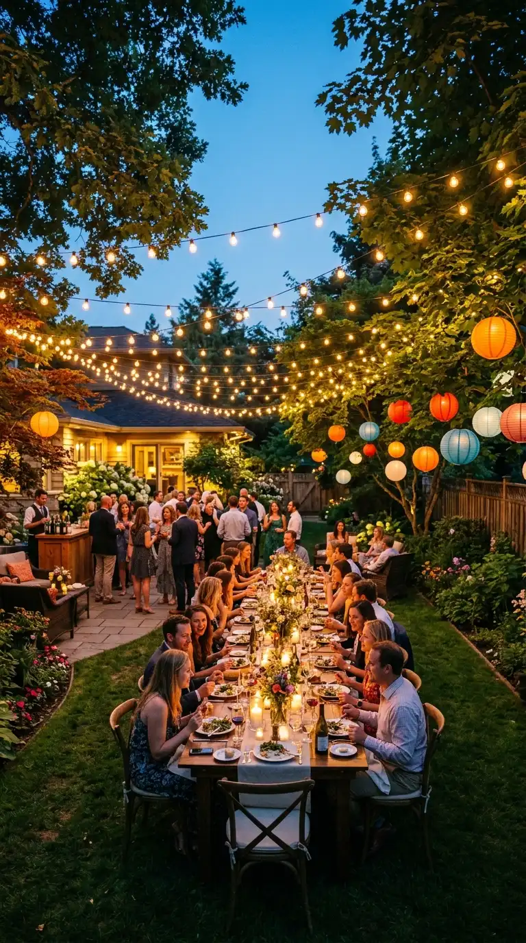 String lights transform a garden party into a magical evening event. Crisscross warm-toned lights overhead between trees, across a pergola, or along a fence. Use large globe bulbs or Edison bulbs for a vintage feel. Add paper lanterns or glass lanterns with candles for extra ambiance. The soft, warm glow extends the party into the night.