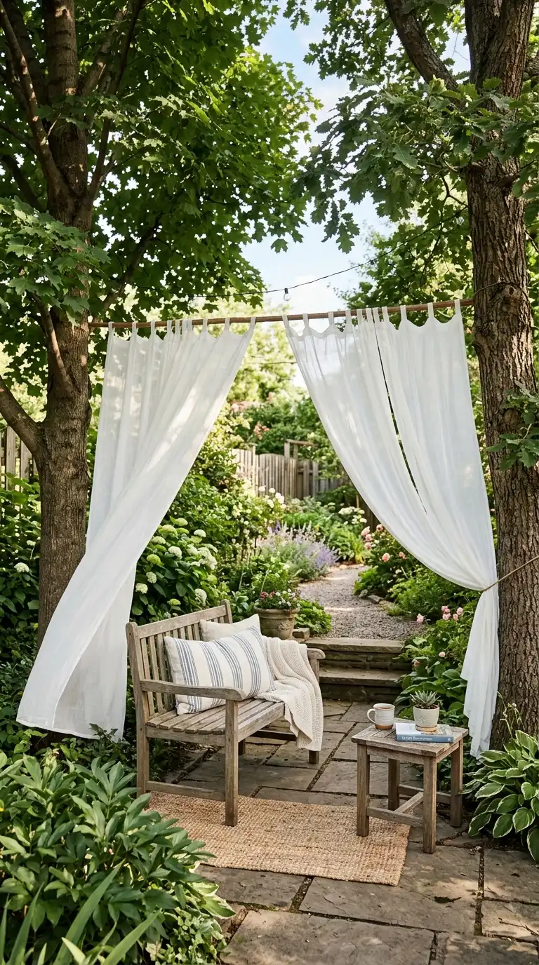 Create a sense of enclosure and privacy with outdoor curtains or sheer fabric hung from a pergola, between trees, or along a fence. Use affordable fabric from discount stores, and attach it with simple hooks or rods. Curtains soften the space, create intimate zones, and can be drawn for privacy or tied back to open up the area.