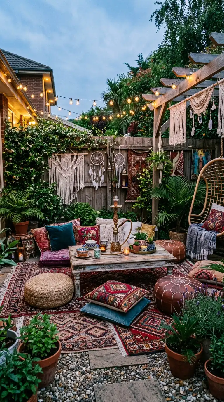 A bohemian outdoor lounge is relaxed, layered, and full of texture. Use floor pillows, poufs, and low wooden tables instead of traditional furniture. Layer colorful patterned rugs to define the space. Add macrame wall hangings, dreamcatchers, and woven baskets as decor. Hang festoon lights or lanterns overhead. Use mismatched ceramics and glassware for drinks. The bohemian style is personal, collected, and effortlessly chic.