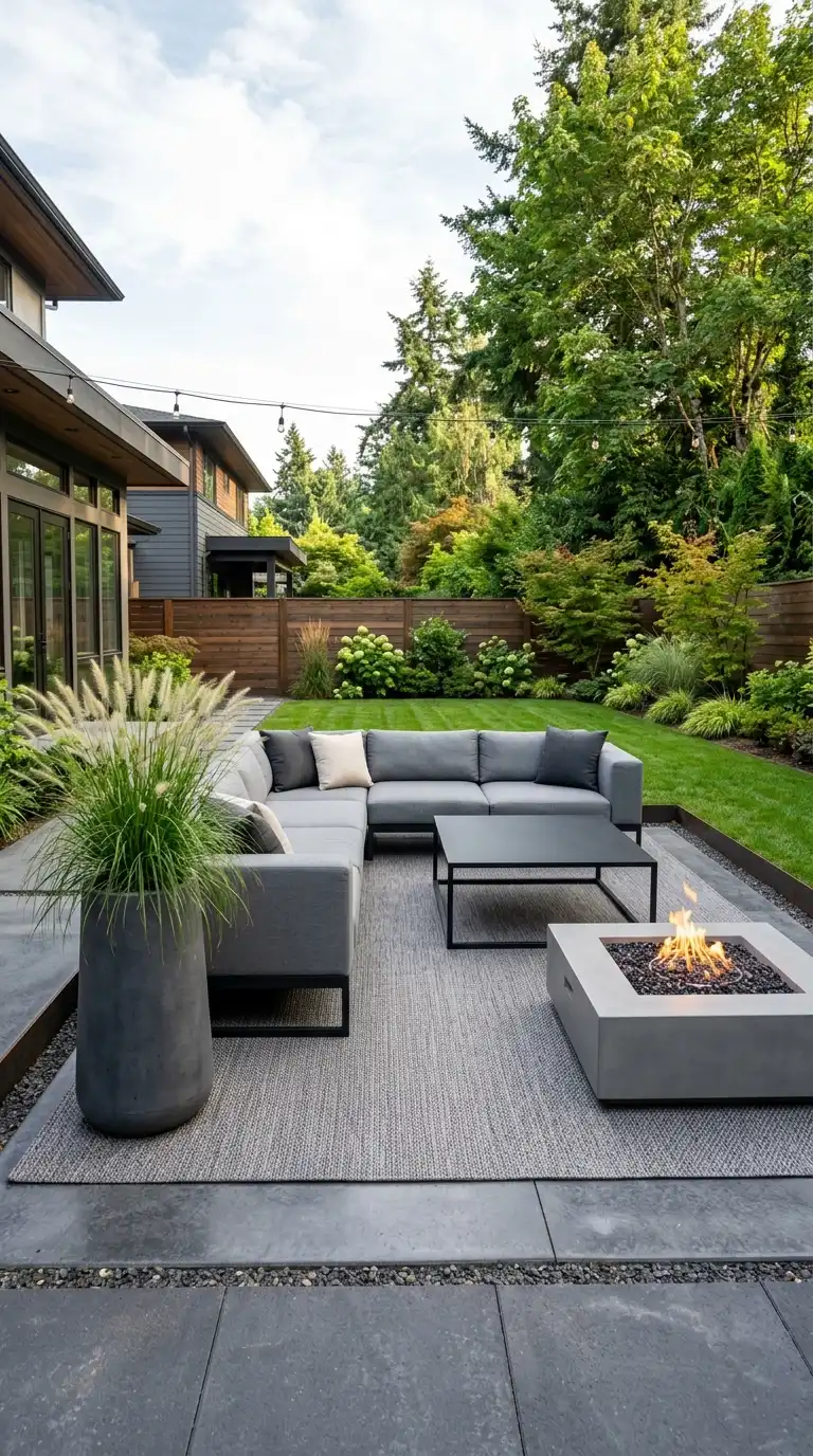 Modern minimalist decor emphasizes clean lines, a restrained color palette, and uncluttered surfaces. Use sleek, low-profile furniture in neutral tones—gray, white, or black. Add a single statement piece like a sculptural planter or a geometric fire pit. Use concrete, metal, and wood materials. Keep accessories to a minimum—a few cushions, a simple vase, and a single outdoor rug. The result is calm, sophisticated, and uncluttered.
