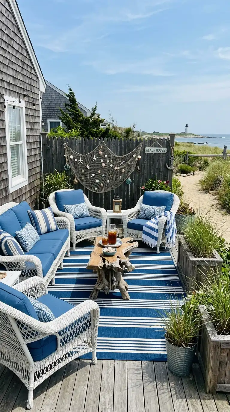 Coastal decor evokes the calm and beauty of the seaside. Use white or light blue furniture, natural wood accents, and plenty of white cushions. Add rope details, driftwood, and shells as decor. Use a blue and white striped outdoor rug, and hang a net with starfish or seashells. Plant beach grasses and succulents in weathered planters. The atmosphere is light, breezy, and relaxing.