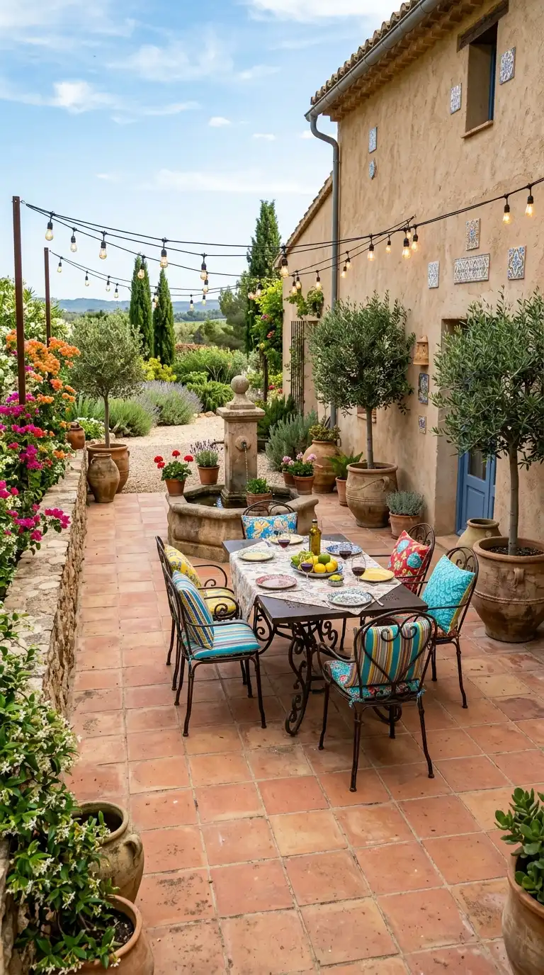 Mediterranean decor is warm, vibrant, and inviting. Use terracotta tiles or warm stone flooring. Add wrought iron furniture with colorful cushions in terracotta, yellow, and blue. Plant olive trees, lavender, and rosemary in terracotta pots. Use ceramic tiles as tabletops or wall art. Add a central fountain or a water feature. Hang string lights or paper lanterns for evening warmth.