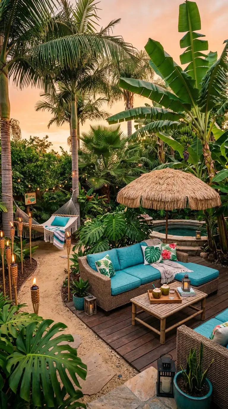 Tropical decor is lush, vibrant, and exotic. Use bold, colorful cushions and outdoor fabrics in shades of turquoise, coral, and lime green. Add bamboo or rattan furniture. Plant large-leaf plants like monstera, banana trees, and palms. Use tiki torches for lighting, and add a thatched umbrella or cabana. Hang a hammock between two trees. The atmosphere is vacation-like and energizing.