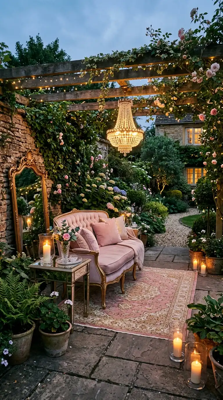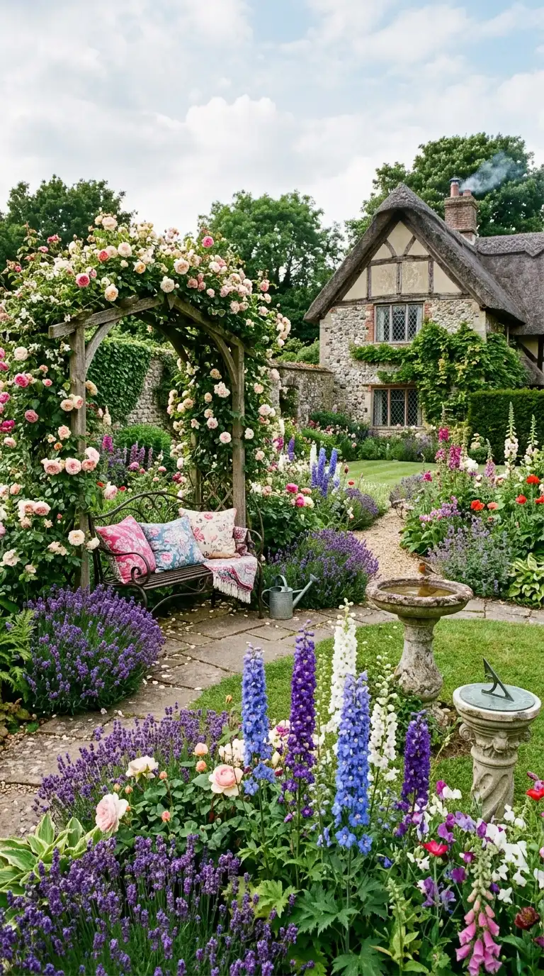 English cottage decor is romantic, abundant, and colorful. Use wrought iron or wooden furniture with floral cushions. Plant roses, lavender, delphiniums, and foxgloves in overflowing beds. Add a wooden arbor with climbing roses, a birdbath, and a sundial. Use vintage garden tools and watering cans as decor. A thatched or wooden bench invites you to sit and enjoy the blooms.