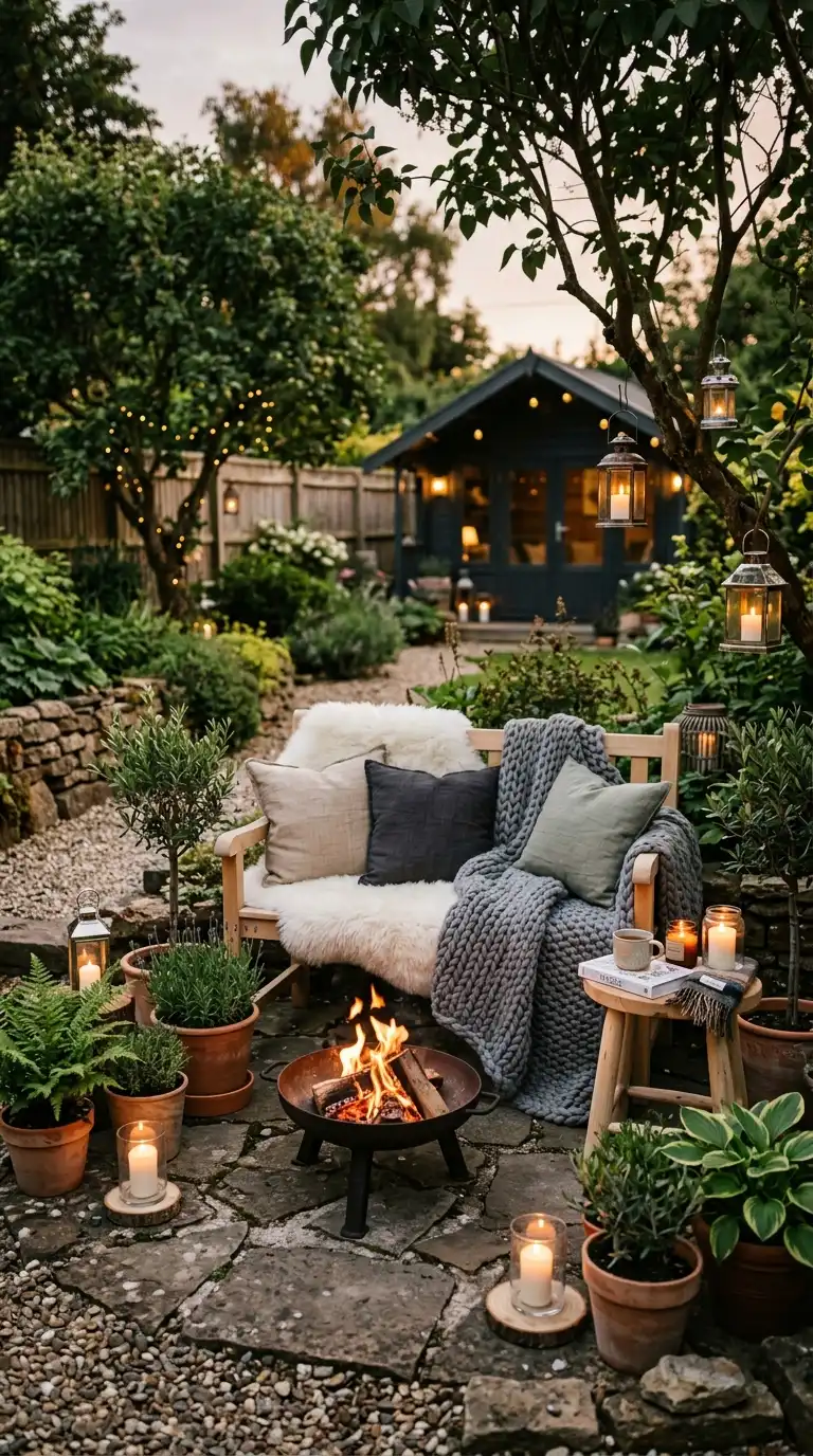 Scandinavian decor emphasizes coziness, simplicity, and natural materials. Use light wood furniture, sheepskin throws, and chunky knit blankets. Add a fire pit or a small fireplace for warmth. Use soft, warm lighting from candles and lanterns. Keep the color palette neutral—white, beige, gray, and pale wood. Add a few potted plants for greenery. The atmosphere is calm, cozy, and inviting.