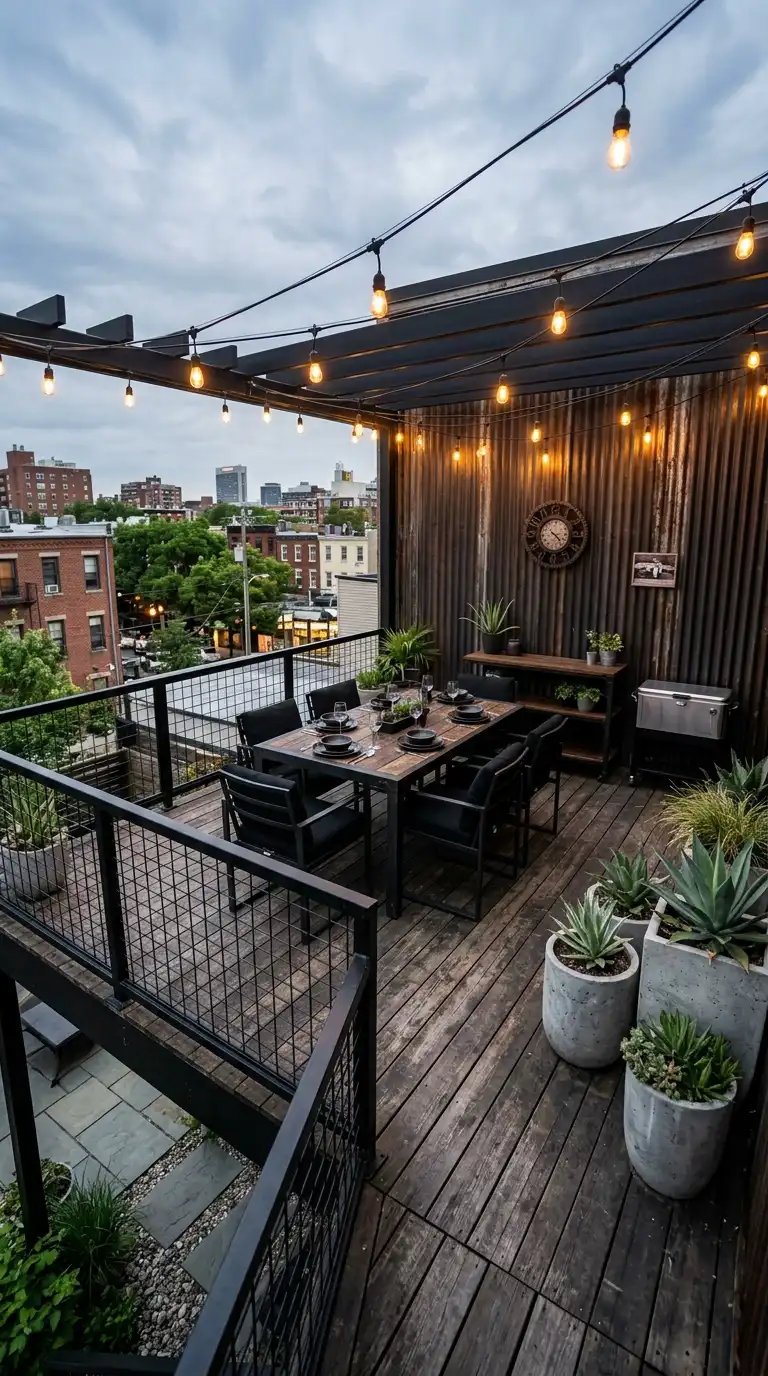Industrial decor is edgy, modern, and raw. Use metal furniture, concrete planters, and dark cushions. Add a corrugated metal or brick accent wall. Use factory-style pendant lights or Edison bulb string lights. Plant hardy, sculptural plants like agave, yucca, and ornamental grasses. Use black, gray, and charcoal as primary colors. The look is bold and urban.