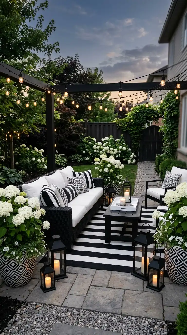 A monochrome black and white palette is dramatic, modern, and sophisticated. Use black furniture with white cushions, or white furniture with black accents. Add a black and white striped outdoor rug. Use geometric planters in black and white. Plant white flowers like hydrangeas or white roses. Add black lanterns and white string lights. The look is bold and graphic.