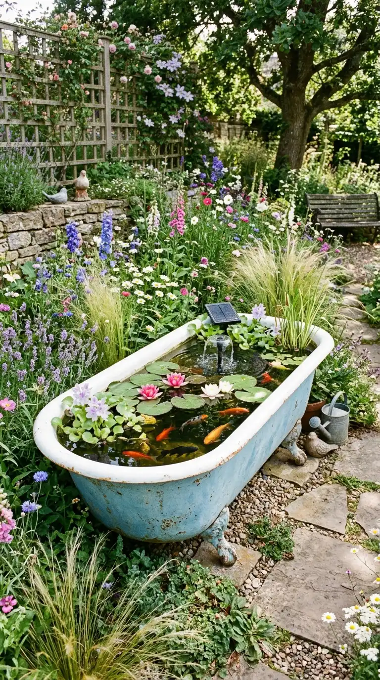 Repurpose an old clawfoot bathtub into a unique, vintage pond. Seal the drain, place the tub on a level surface, and fill with water. Add aquatic plants and a small pump for circulation. Paint the exterior a bright color for a whimsical touch, or leave it as is for rustic charm. A bathtub pond becomes a conversation piece and a focal point in any garden.