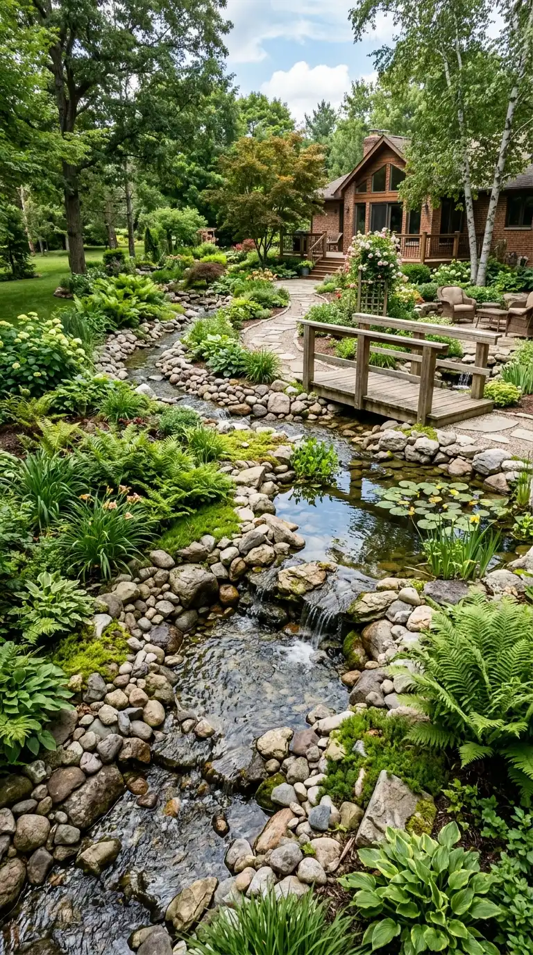Create a meandering creek bed that flows into a small pond for a naturalistic look. Dig a shallow, winding channel lined with river rocks and gravel, with a pond at the lower end. Use a recirculating pump to move water from the pond back to the top of the creek. The sound of trickling water and the sight of a running creek add tranquility to any landscape.