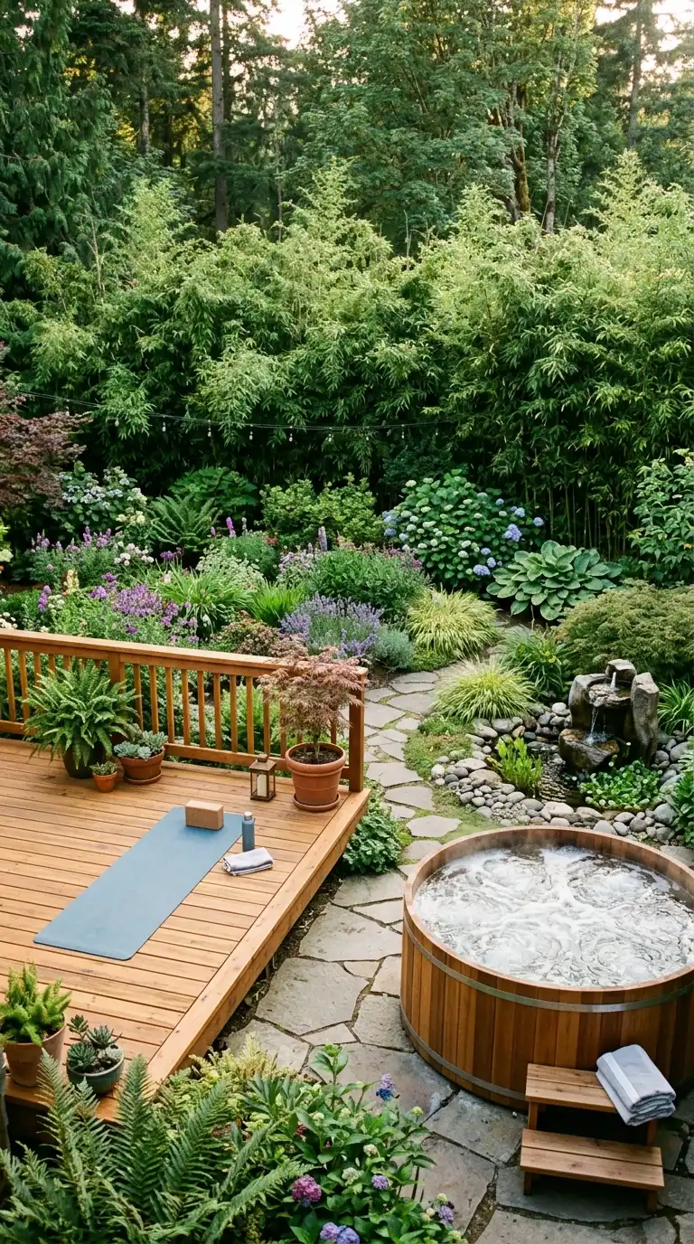 Extend the wellness benefits of your hot tub by creating a dedicated yoga or meditation space nearby. A flat deck or stone platform with enough room for a yoga mat, a small water feature for soothing sound, and privacy plantings create a complete relaxation zone. Use the space for stretching before soaking or for quiet reflection after.