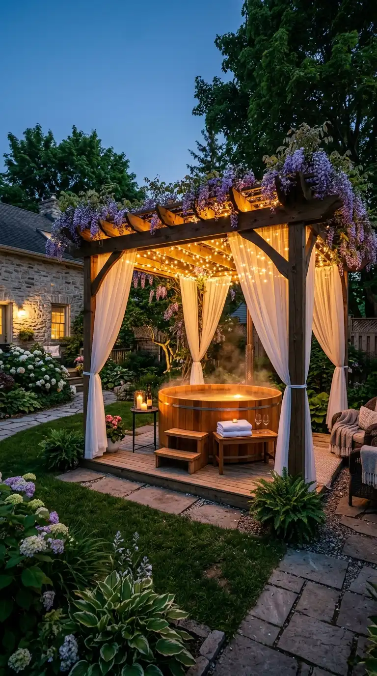 A pergola or gazebo adds architectural interest and provides shade and shelter for your hot tub. Choose a design that complements your home—a sleek metal pergola for a modern look, a wooden structure for rustic charm, or a thatched-roof cabana for a tropical feel. Add curtains for privacy and mosquito netting for comfort. A pergola also provides a structure for hanging string lights or lanterns for evening ambiance.