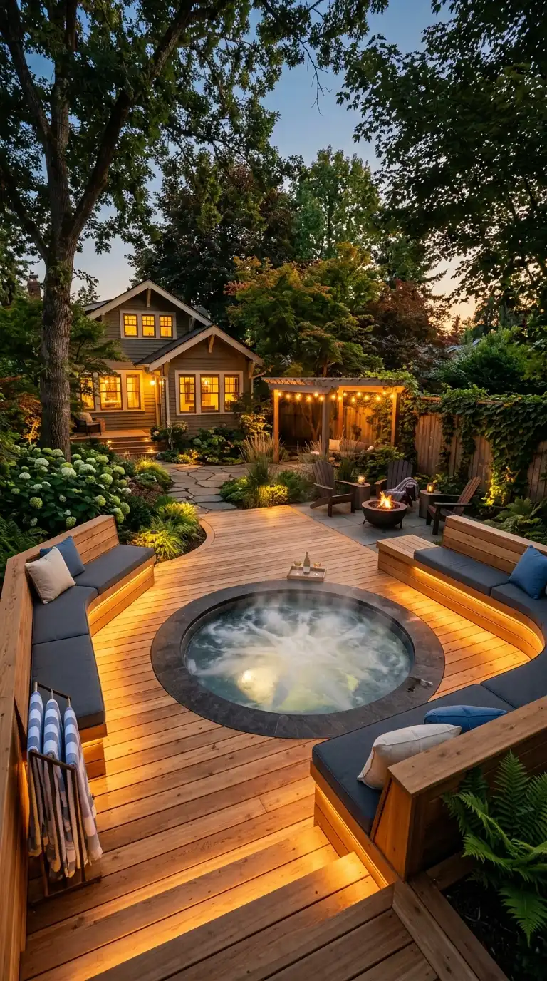 A deck or platform elevates your hot tub, creating a dedicated zone within your backyard. Use durable, slip-resistant materials like composite decking, ipe wood, or natural stone. Build the deck flush with the hot tub rim for easy entry, or create a sunken design for a built-in look. A raised deck can also accommodate steps and integrated seating.