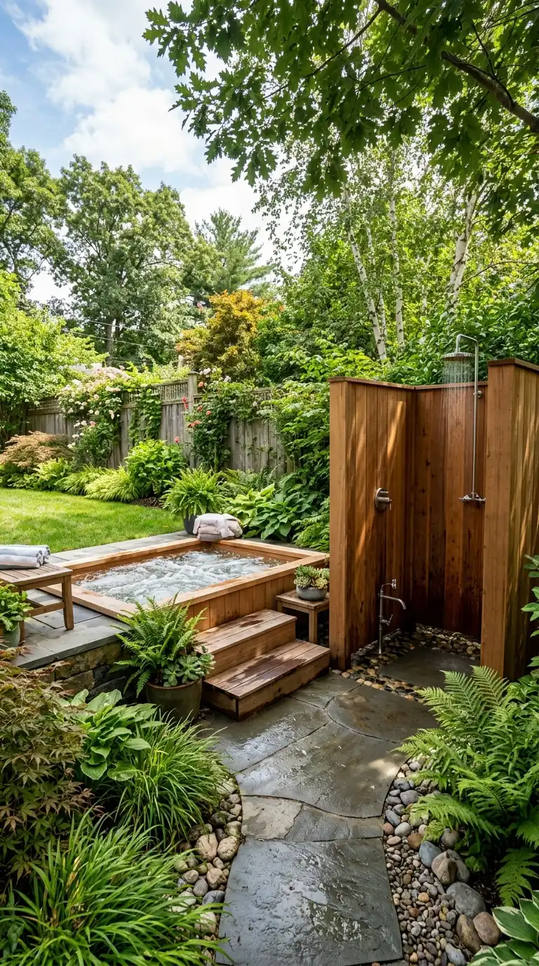 An outdoor shower adjacent to your hot tub adds convenience and a touch of luxury. Use it to rinse off before and after soaking, and to cool down between sessions. Enclose the shower with natural wood or stone walls for privacy, and add a rainfall showerhead, foot wash, and hooks for towels.