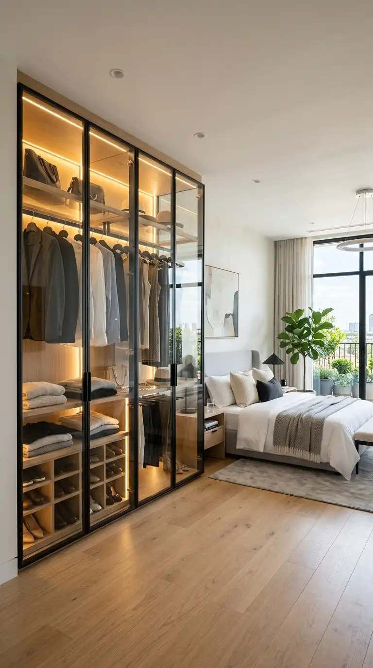 3. Glass-Front Wardrobe with Slim Metal Frames