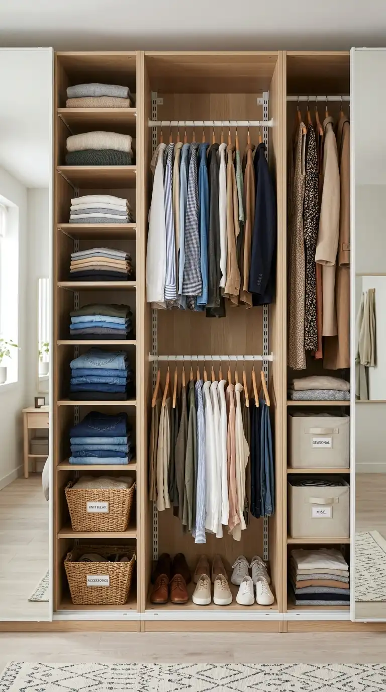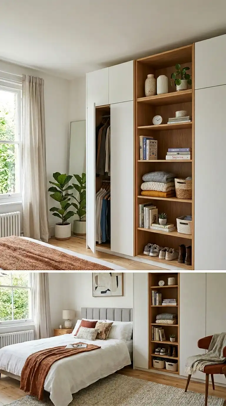 Combine open shelving with closed cabinets for a balanced mix of display and concealment. Use open sections to showcase accessories, books, or folded knitwear, while closed sections hide everyday clothing. This approach creates visual interest and prevents the wardrobe from feeling too monolithic. Position open sections at eye level for easy access and display.