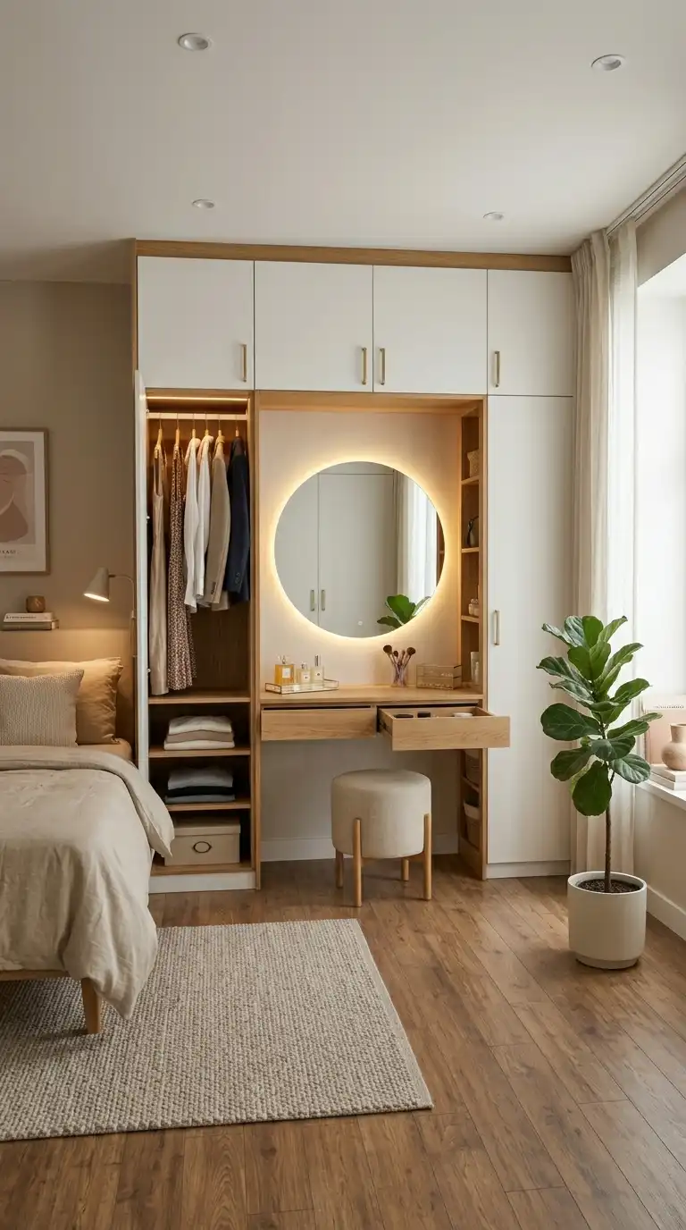 Combine storage and grooming by integrating a dressing table into wardrobe design. Position the dressing table at the center or one end of the unit, with a mirror, stool, and dedicated storage for makeup and accessories. This setup streamlines the morning routine, keeping all beauty and wardrobe essentials in one cohesive space. For a modern look, choose a floating table surface with no visible supports and a backlit mirror.