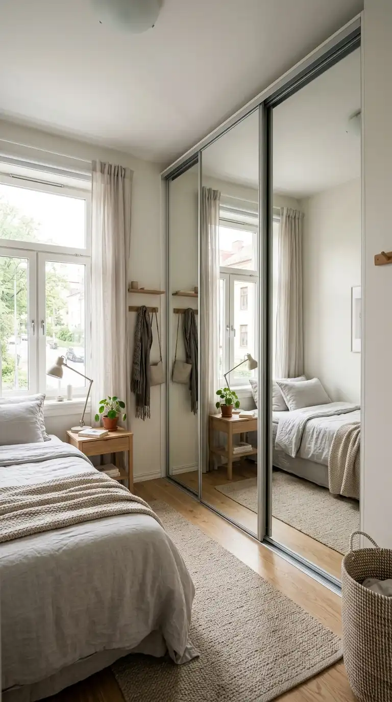 Mirrored panels serve both practical and spatial purposes. A full-length mirror integrated into the wardrobe eliminates the need for a separate mirror, reducing visual clutter. The reflective surface also bounces light around the room, making the space feel larger and brighter. For a minimalist approach, choose frameless mirrors or those with slim, discreet edges.