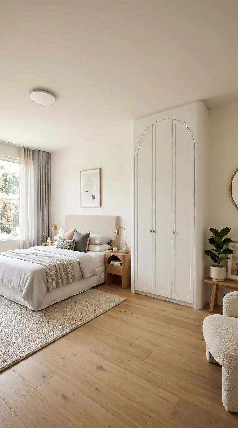 Softening the geometry of a wardrobe with curved or organic forms adds a sense of fluidity and elegance. Rounded corners, arched door tops, or gently curved panels create a softer, more inviting look that contrasts with the clean lines of modern interiors. This design is ideal for bedrooms where a sense of calm and warmth is desired.