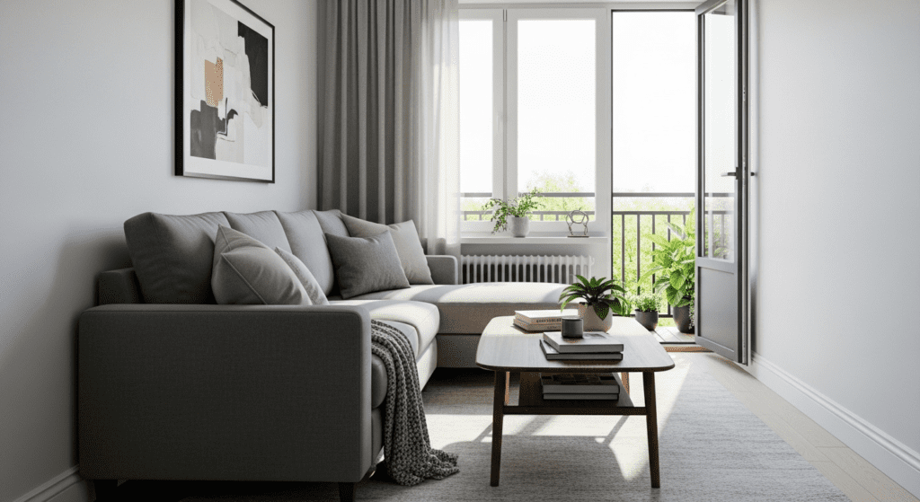 The L-shaped layout provides generous seating without blocking the balcony doors or the light they provide. Add a coffee table in the open area created by the L-shape, and position a floor lamp or side table at the outer corner for lighting and convenience. The sectional’s orientation encourages gathering while maintaining clear sightlines to the balcony.