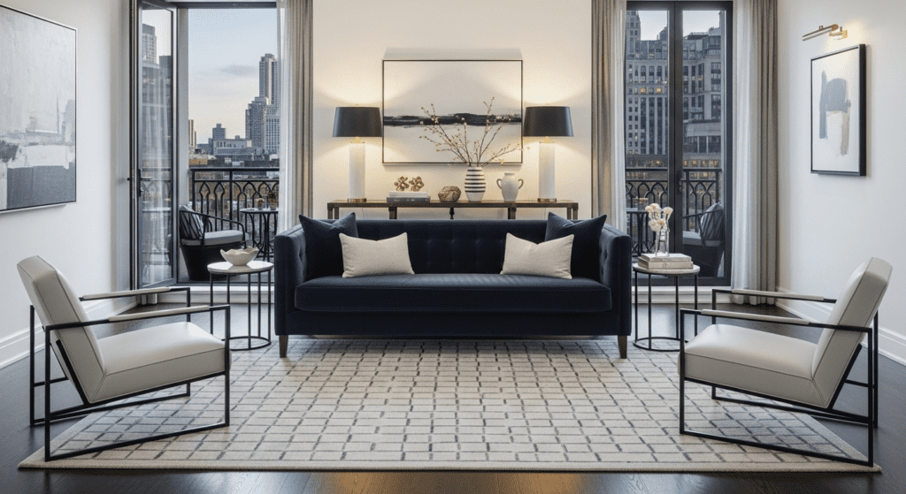 Keep the pathway to the balcony clear and direct—at least 36 inches wide for comfortable passage. Use an area rug to anchor the seating area, positioning it so the rug doesn’t extend into the balcony traffic path. This arrangement works beautifully when your balcony has attractive views or overlooks greenery, water, or city skylines.